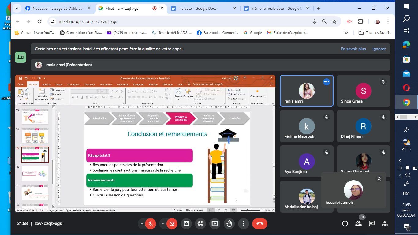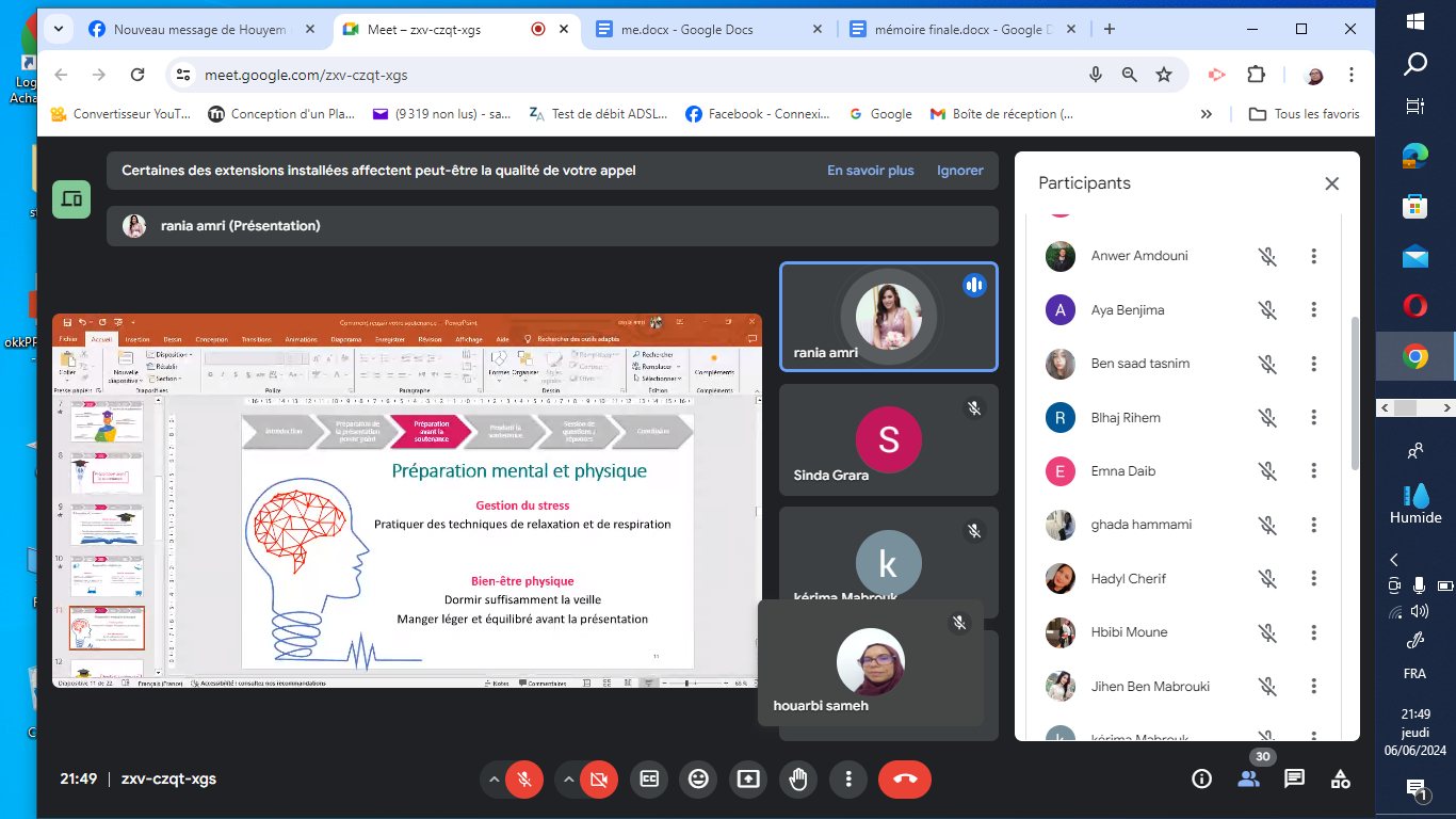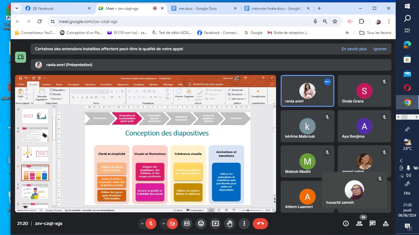Retour en image sur l’évènement en ligne « Comment Réussir votre Soutenance » que nous avons récemment organisé en collaboration avec ISET Zaghouan & le Centre de Carrières et de Certification des Compétences (4C) le 06 juin 2024 .